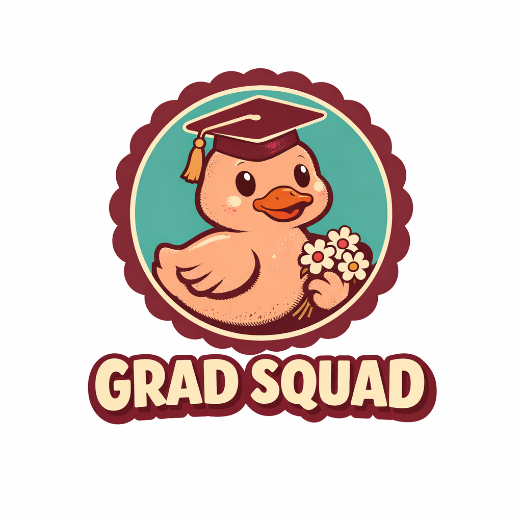 Cheerful Cartoon Duck Graduation Logo with Graduating Cap and Flowers