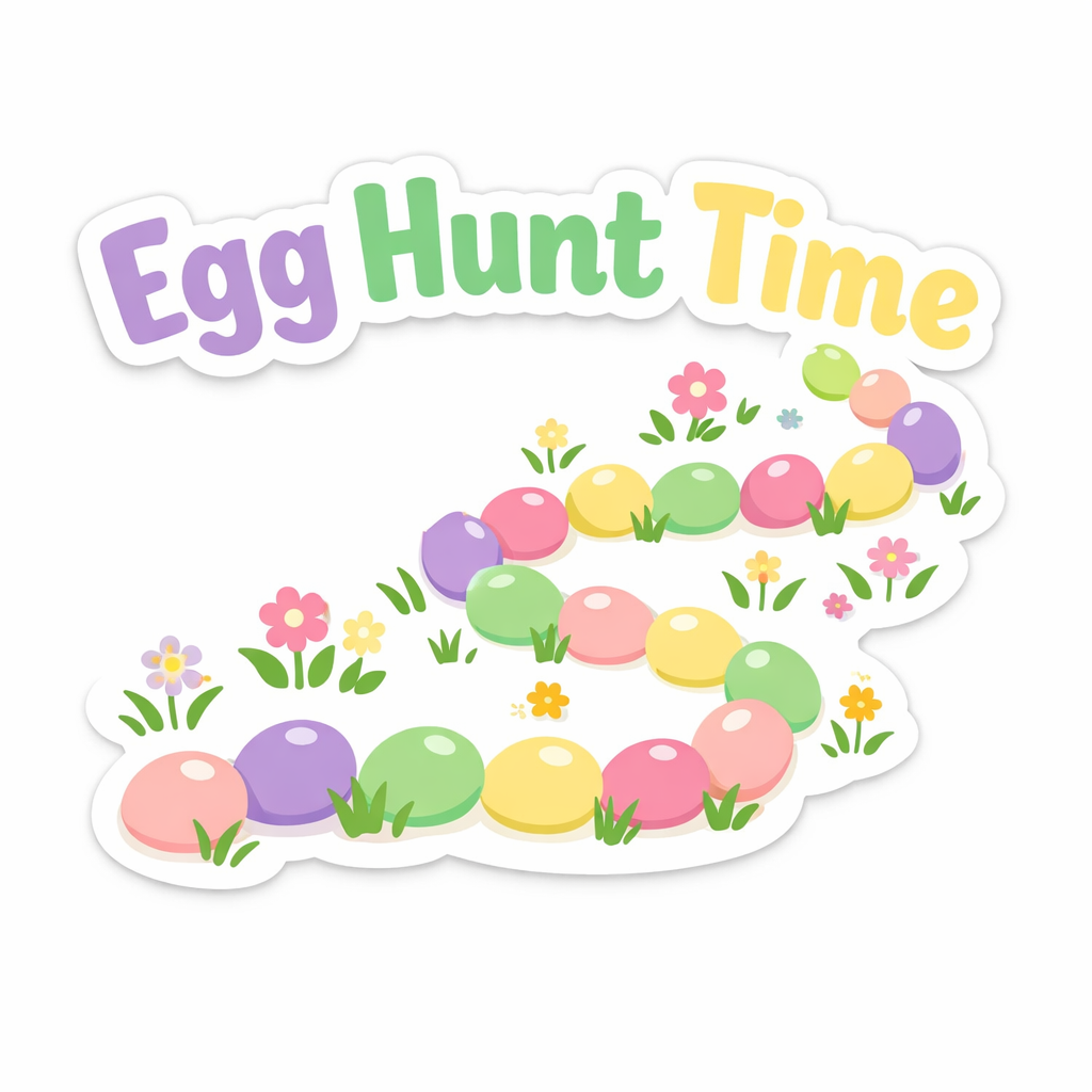 Cheerful Egg Hunt Time Cartoon Sticker with Colorful Easter Eggs