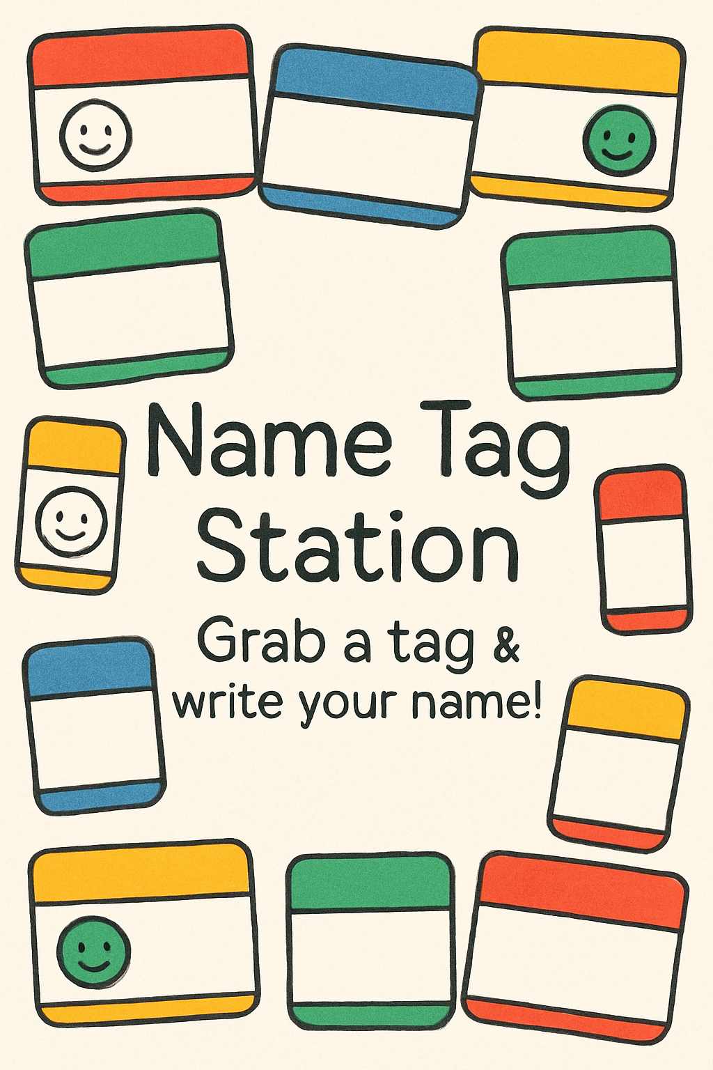 Colorful Cartoon Name Tag Station Invitation Sign for Events