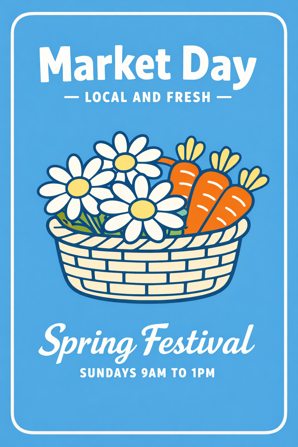 Colorful Market Day Spring Festival Cartoon Poster with Daisies and Carrots Event Sign