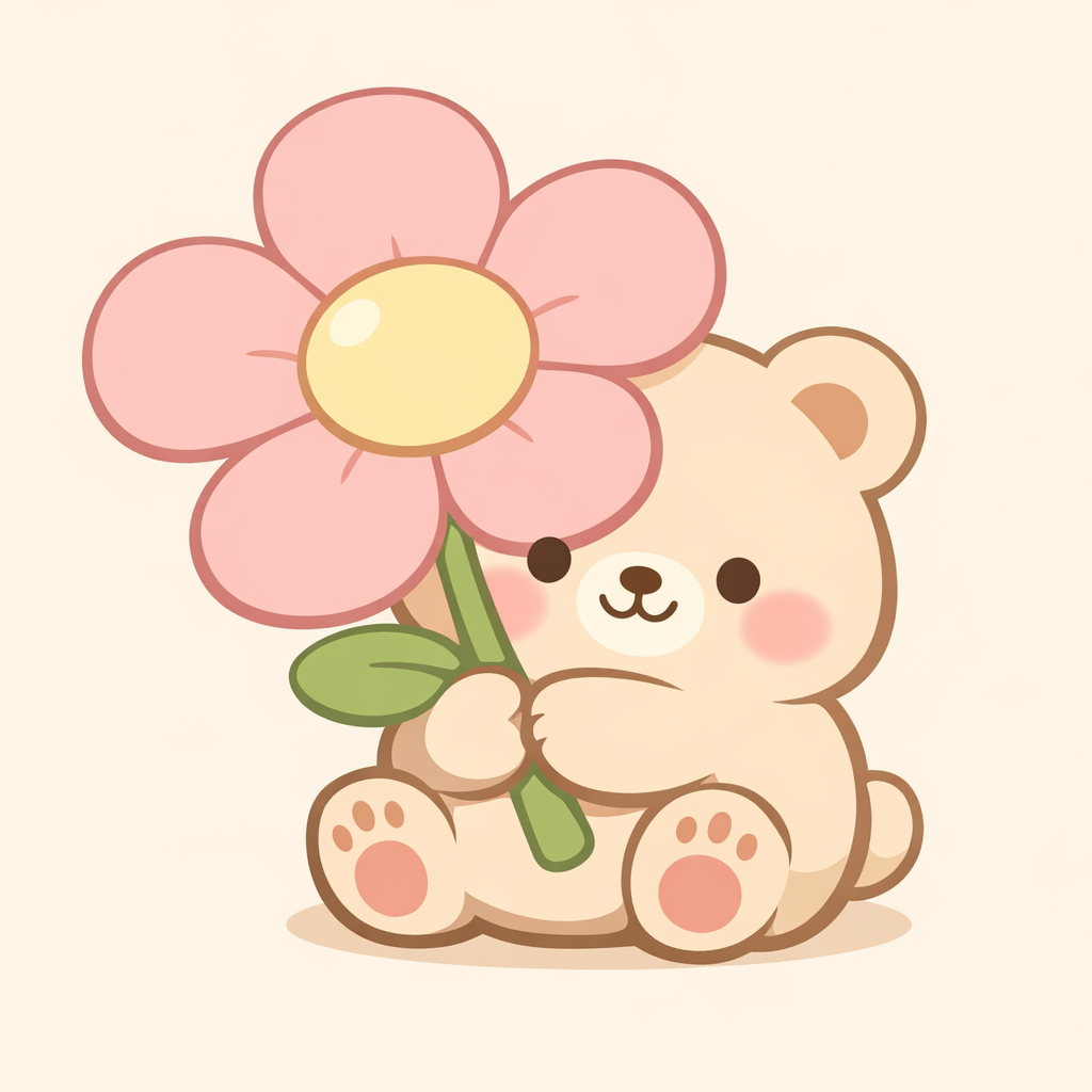 Cute Chibi Beige Bear Holding Flower Illustration Sticker