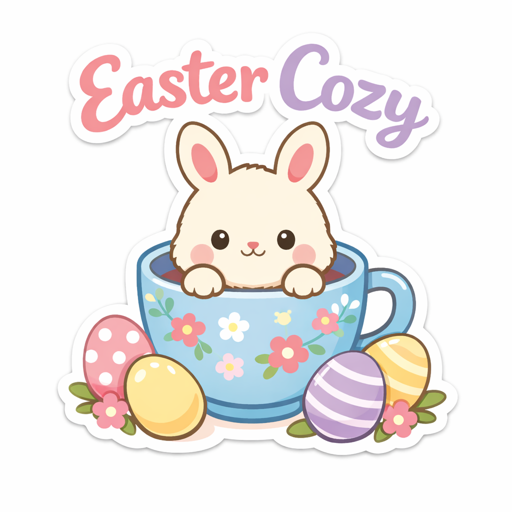 Cute Cream Bunny in Floral Teacup with Easter Eggs Sticker