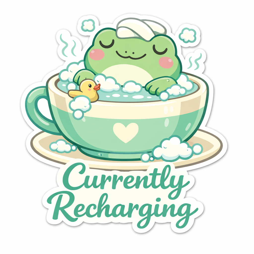 Cute Green Frog in Teacup with Text Currently Recharging Sticker