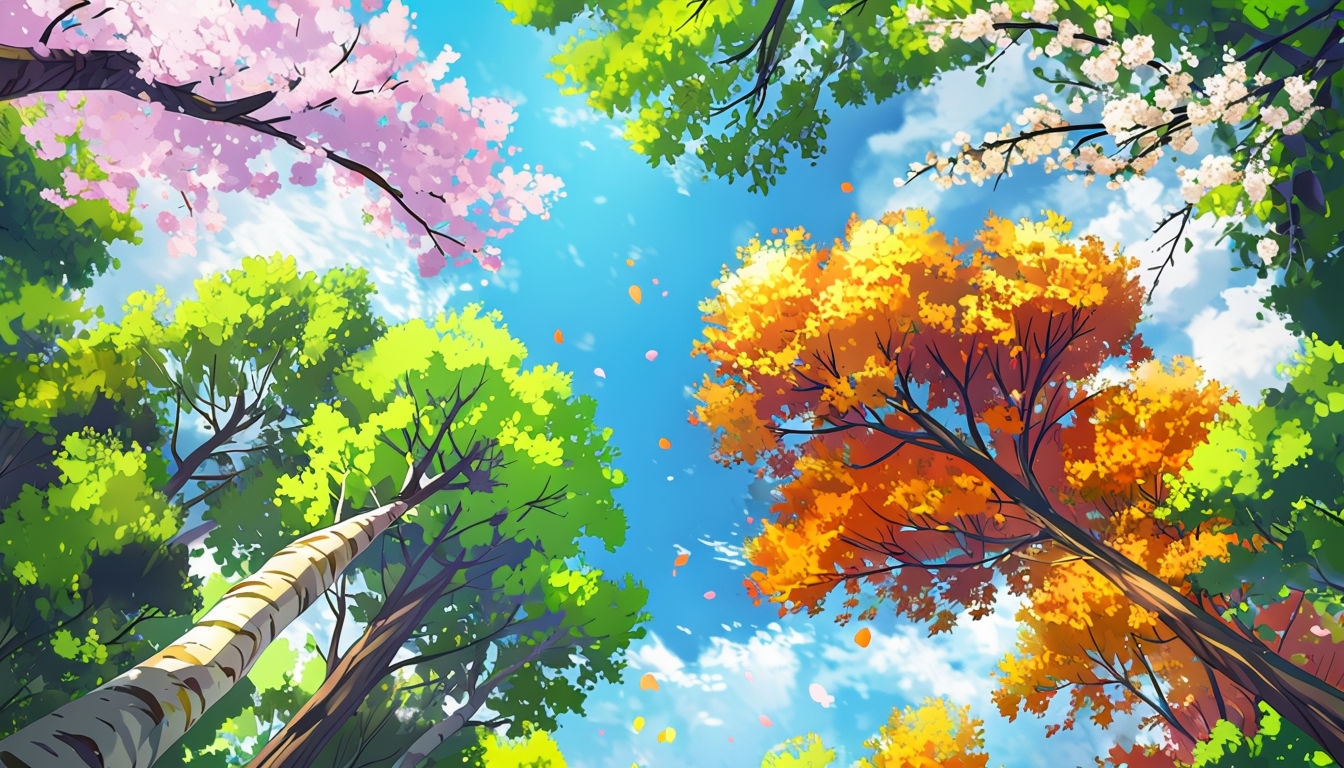 Vibrant Anime-Style Tree Scene Under Bright Blue Sky Virtual Backgrounds