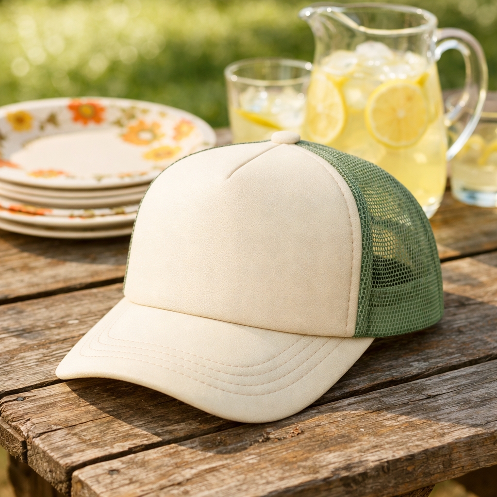 Off-White Baseball Cap and Picnic Scene Mockup
