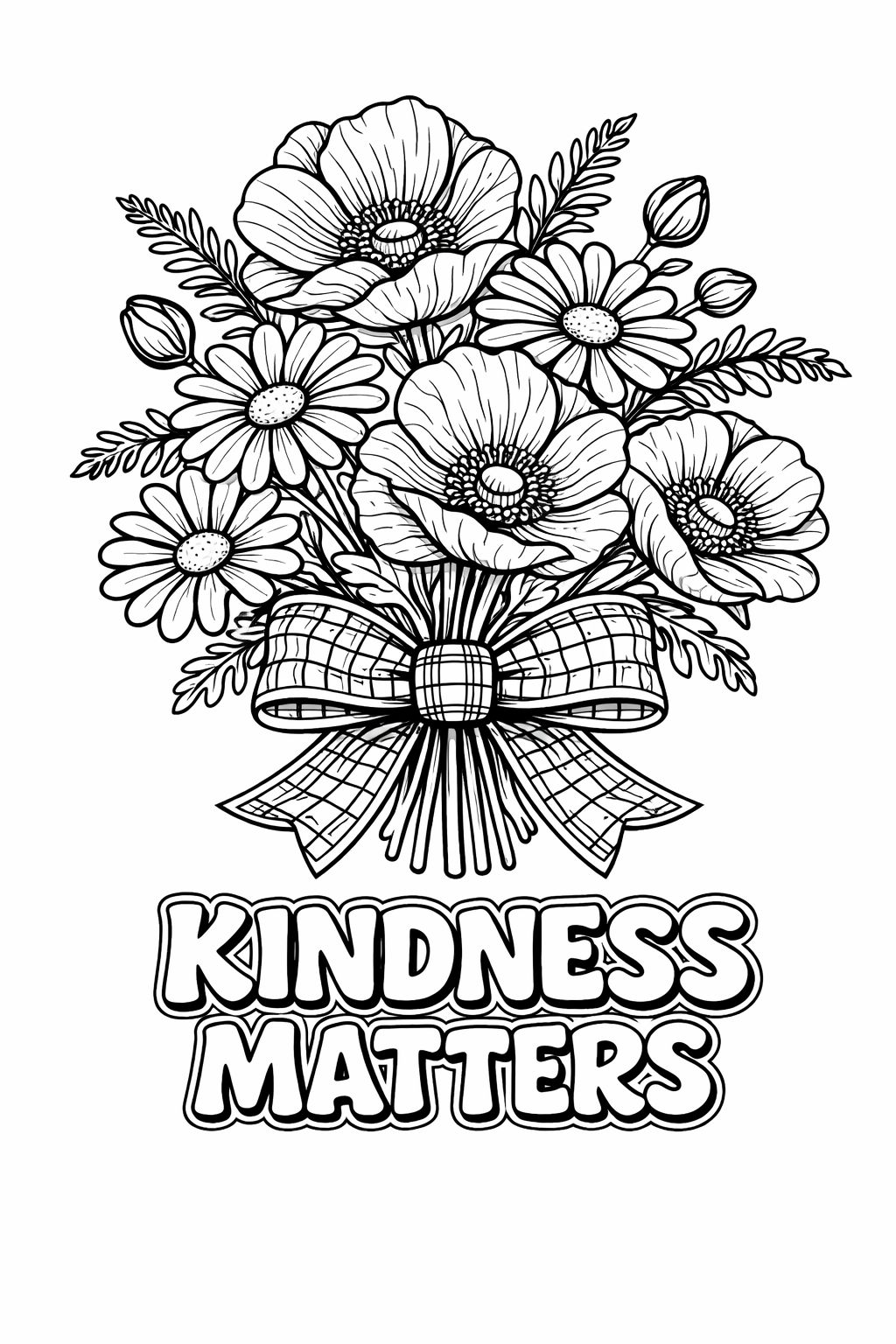 Intricate Black and White Flower Bouquet with Kindness Matters Text Coloring Book Pages