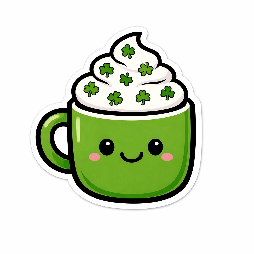 Cute Cartoon Green Mug with Whipped Cream and Shamrocks Sticker
