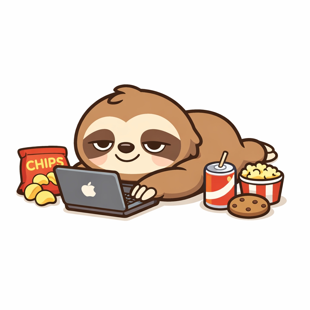 Cute Cartoon Sloth Relaxing with Laptop and Snacks Sticker