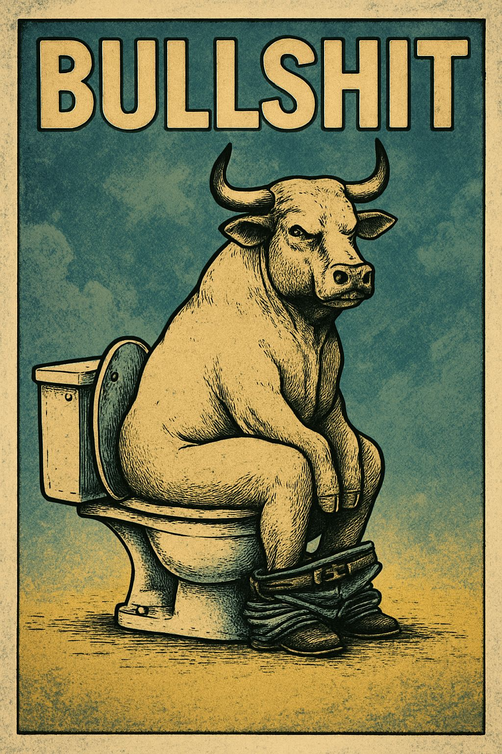 Satirical Bull on Toilet with 'BULLSHIT' Text Illustration Poster