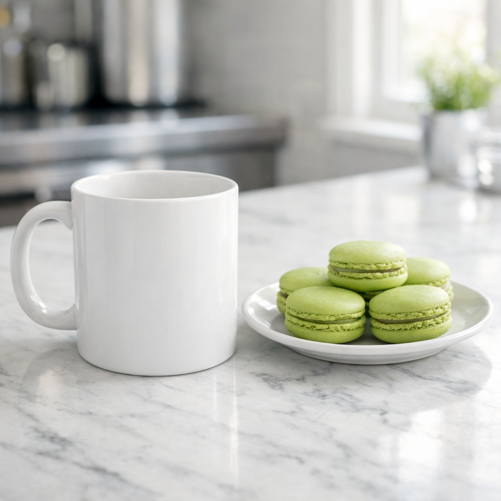 Serene Kitchen Scene with Macarons and White Mug Mockup