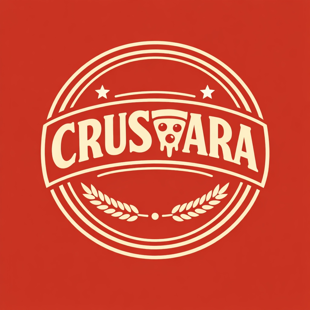 Vintage Pizza Themed CRUSARA Logo Design on Reddish-Brown Background