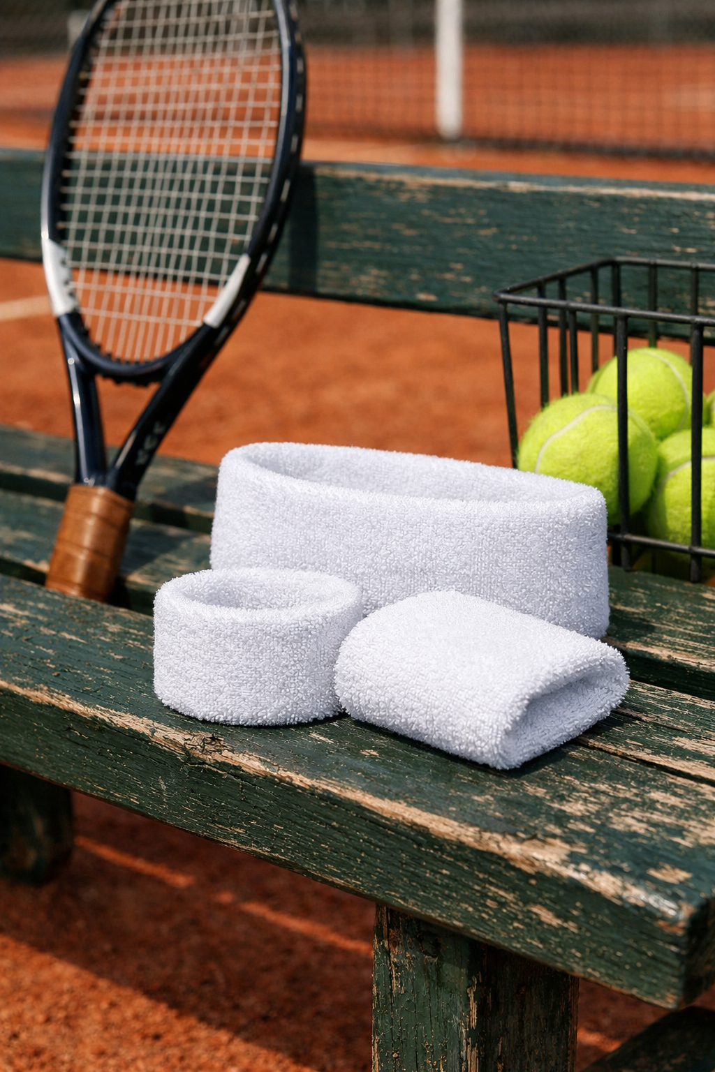 Tennis Gear Arrangement on a Vintage Wooden Bench Mockup