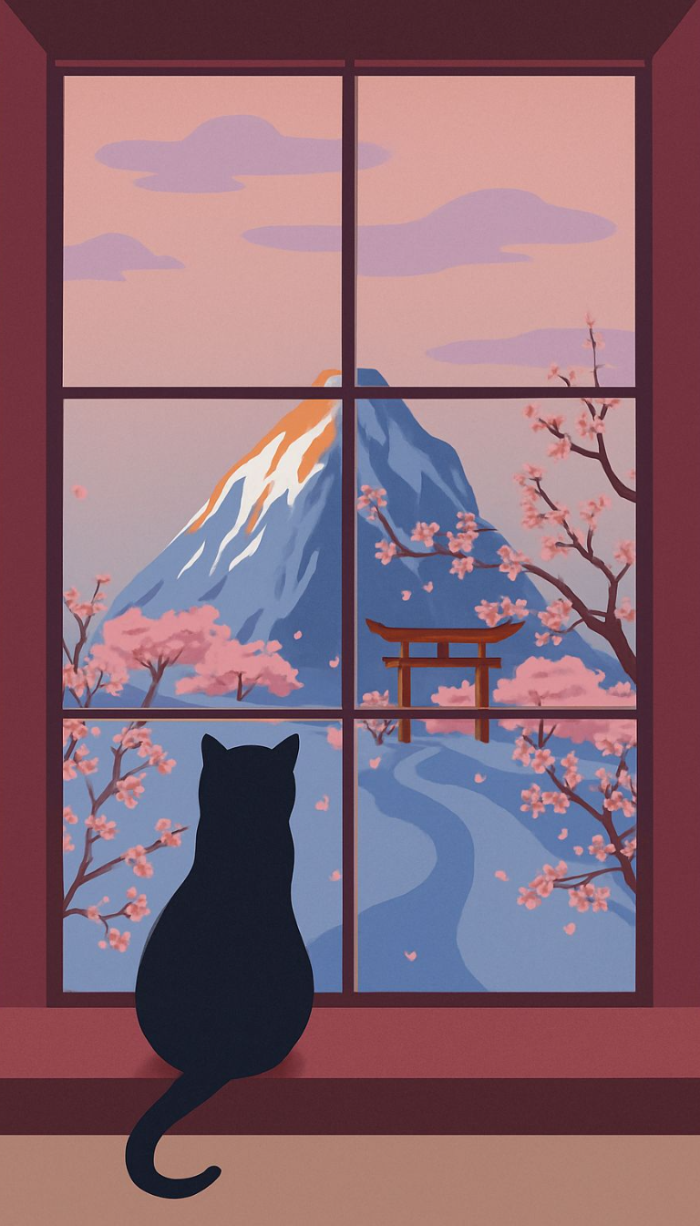 Tranquil Black Cat View with Cherry Blossoms and Mount Fuji Mobile Wallpaper