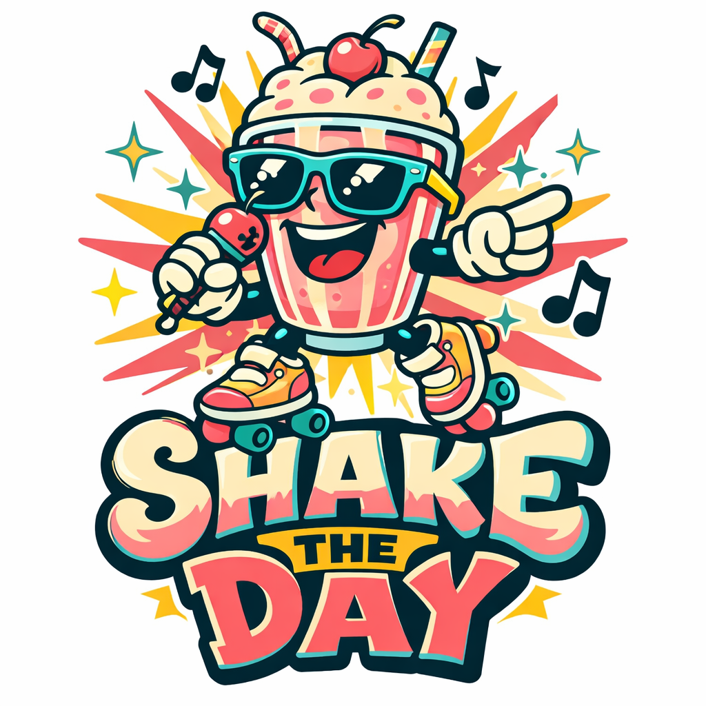 Vibrant Cartoon Milkshake Character with 'Shake The Day' T-Shirt