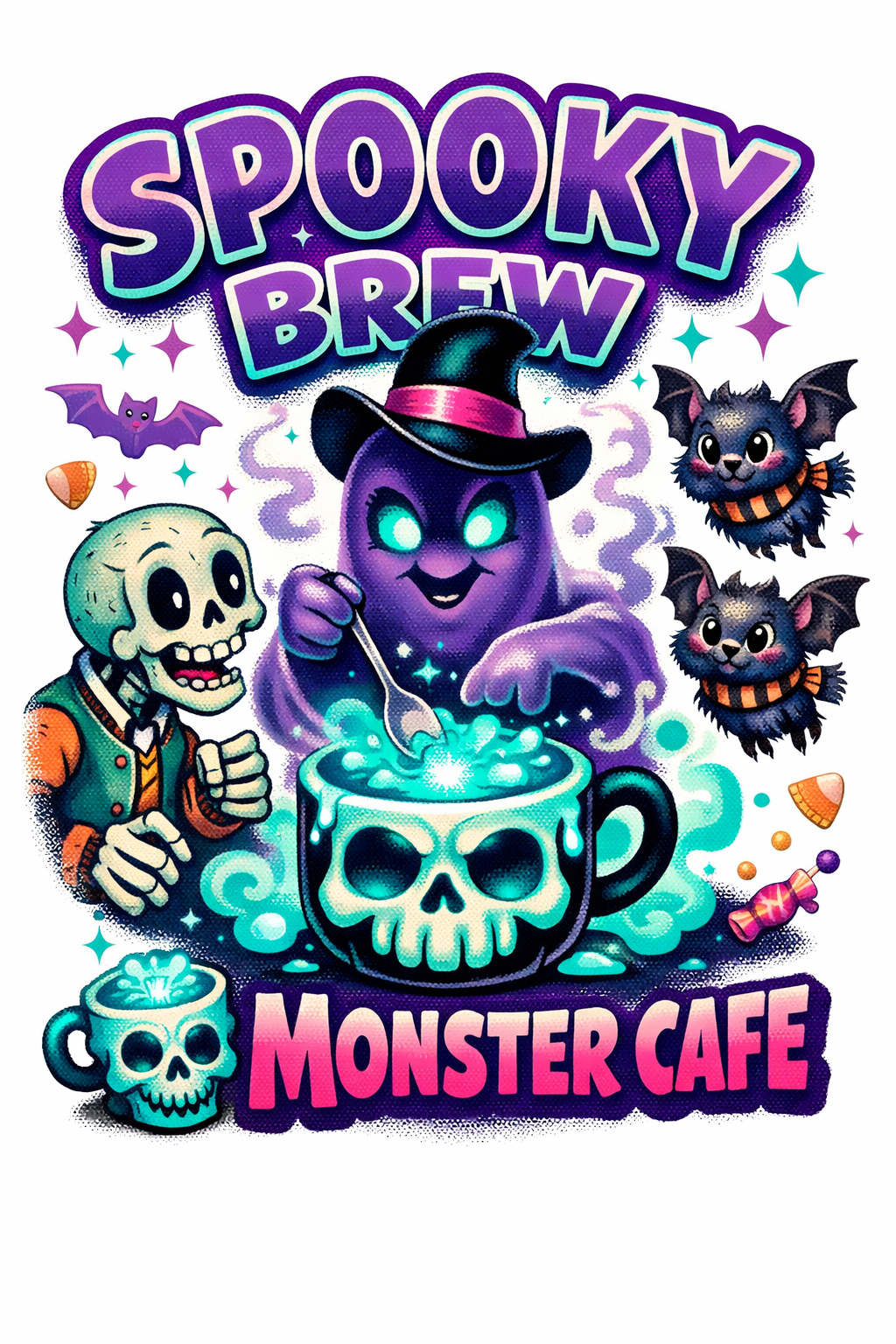 Vibrant Spooky Brew Monster Cafe Cartoon T-Shirt