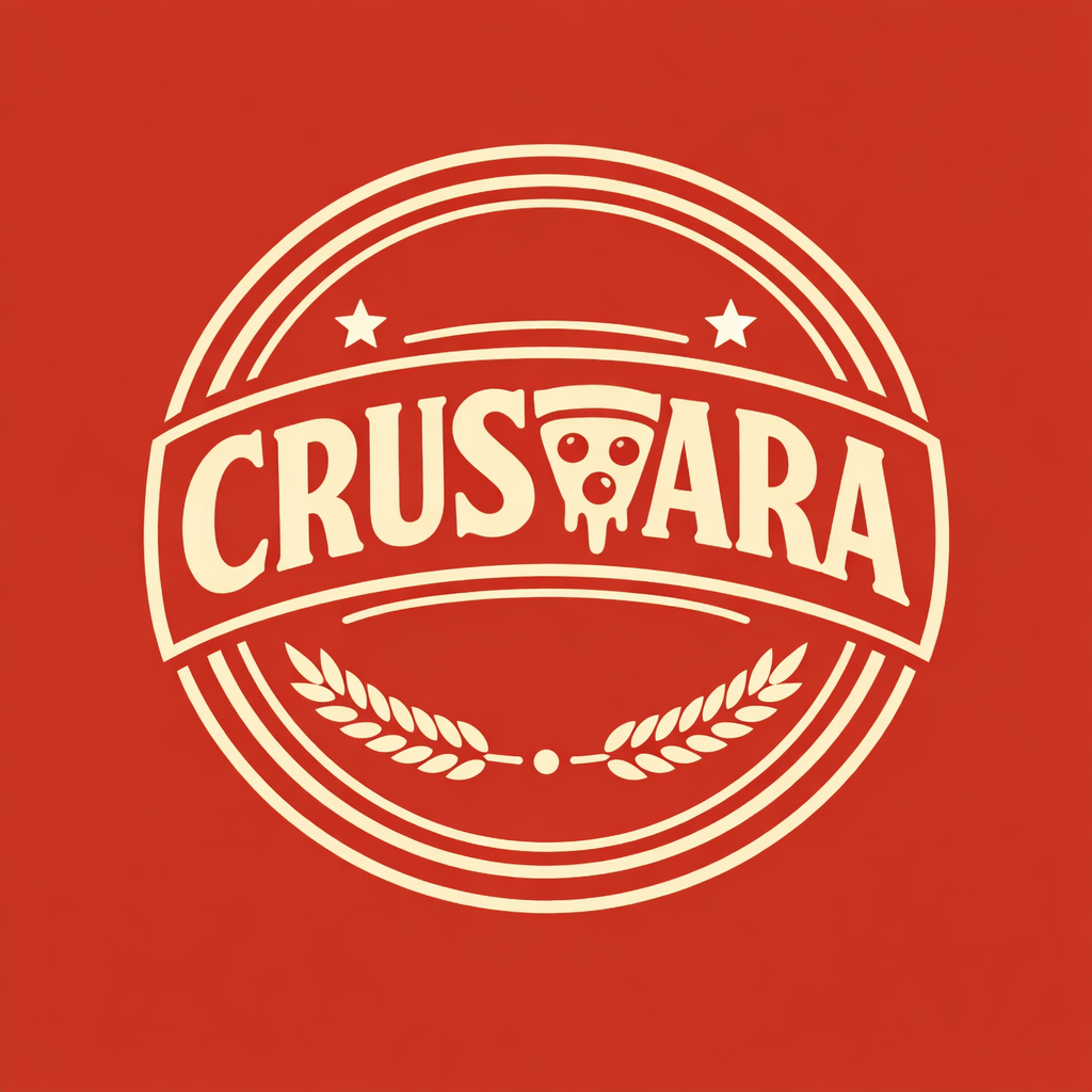Vintage Pizza Themed CRUSARA Logo Design on Reddish-Brown Background